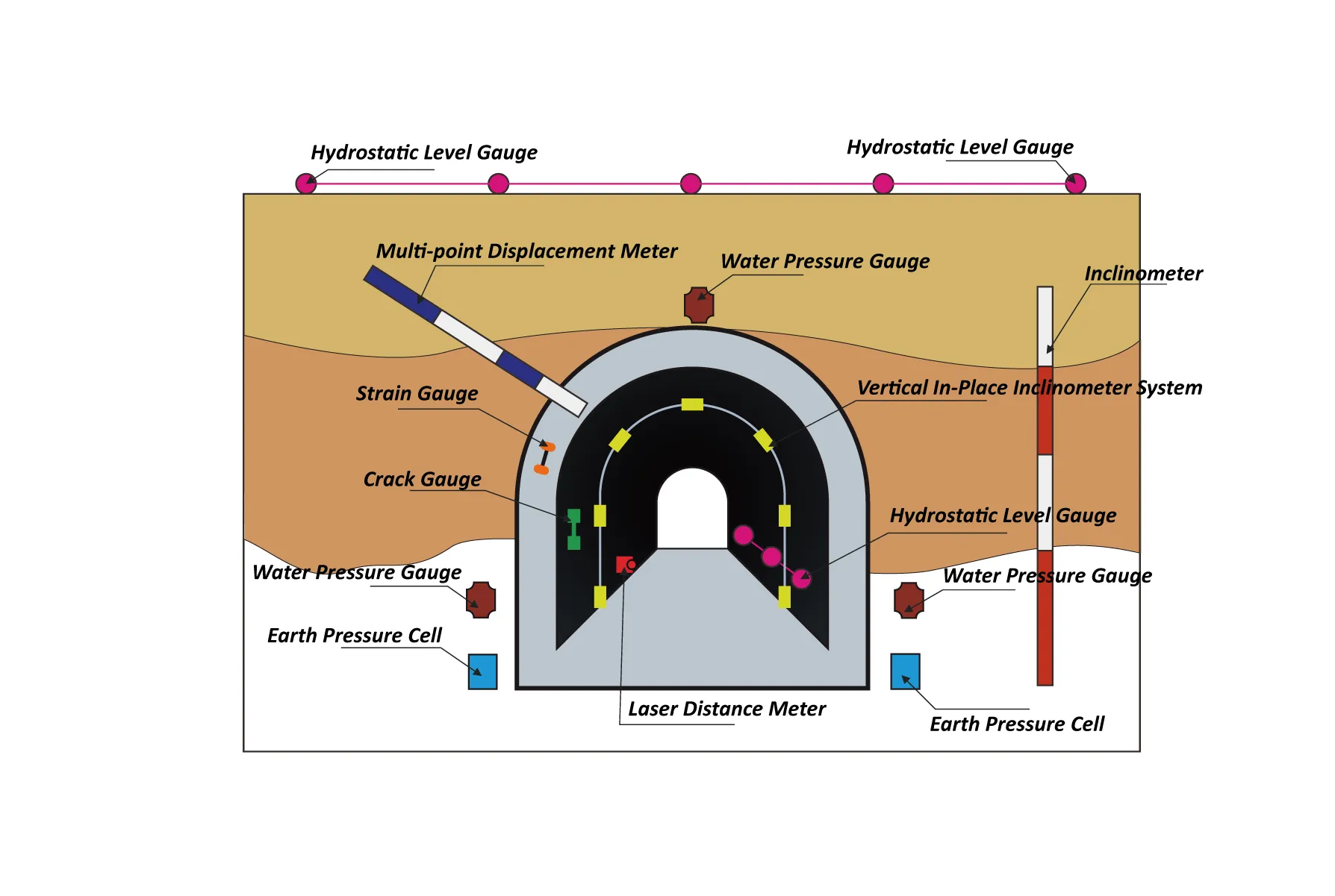 Sadnutie tunela, monitorovanie konvergencie, trhliny v tuneli, monitorovanie štrukturálneho napätia atď.