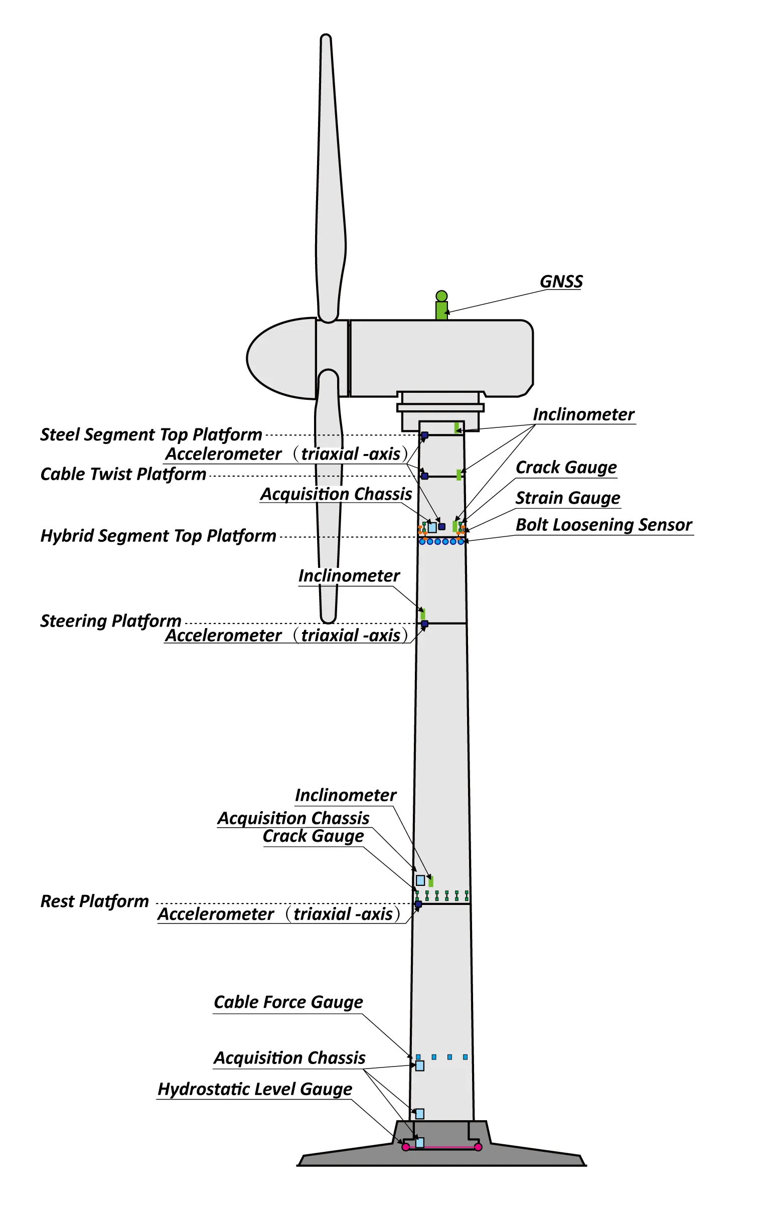 Inštaláciou príslušných snímačov na veže veterných turbín na monitorovanie stavu by hlavný obsah monitorovania konštrukčných prvkov veže veterných turbín mal zahŕňať: monitorovanie vibrácií veže, monitorovanie sklonu veže, monitorovanie namáhania hornej prechodovej časti, monitorovanie trhlín telesa veže, monitorovanie posunu veže, monitorovanie osadenia základov veže, monitorovanie káblových síl atď., aby sa dosiahol cieľ bezpečnej prevádzky veží veterných turbín.